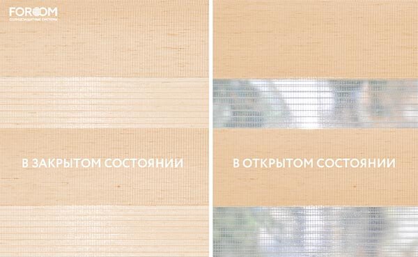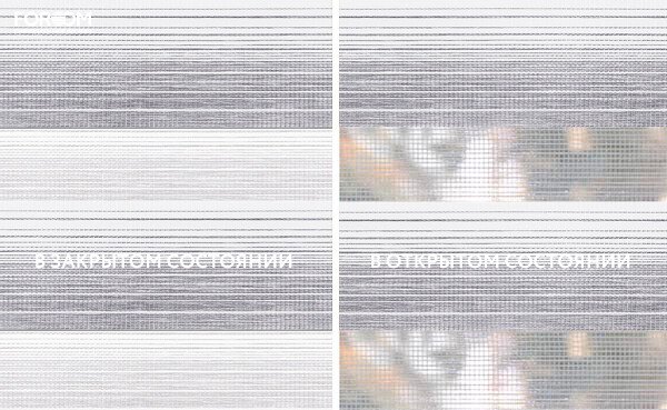 Полотно ткани, состоит из чередующихся горизонтальных полос – прозрачных и непрозрачных. Изменяя положение этих полос относительно друг другу, можно создать целых 3 режима регулировки светом. Например, чтобы в помещении стало светлее, нужно расположить прозрачные полосы друг напротив друга. Если разместить прозрачную и непрозрачную полосу параллельно друг другу, то можно добиться практически полного затемнения.