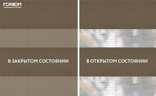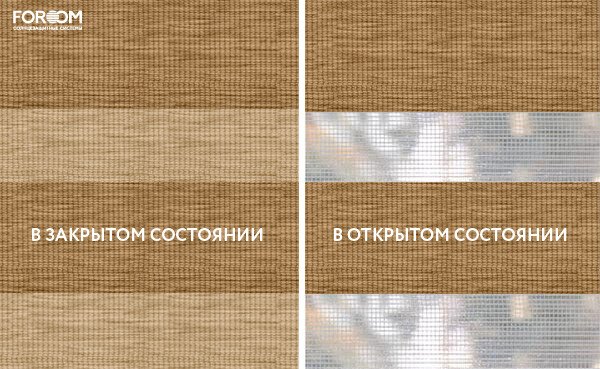 Каждый слой ткани имеет чередующиеся непрозрачные и прозрачные полосы. При смещении полос друг относительно друга можно добиться полного затемнения («ночь», когда непрозрачные полосы совпадают), максимального светопропускания («день», когда совпадают прозрачные полосы) или промежуточных режимов, создавая эффект «зебра».